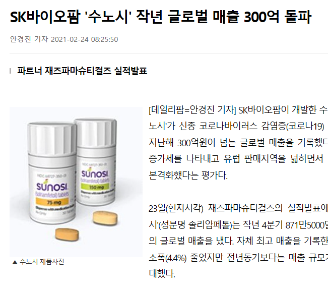 SK바이오팜의 '세노바메이트'는 현재 유럽에 시판 판매 진행 중입니다. 2분기 정도에는 승인이 날 수 있을 것으로 바이오팜에서는 기대하고 있다고 하는데요. 아마 판매 승인이 난다면, 한번 바이오팜 주주분들꼐는 좋은 소식이 되지 않을 까 싶습니다.
