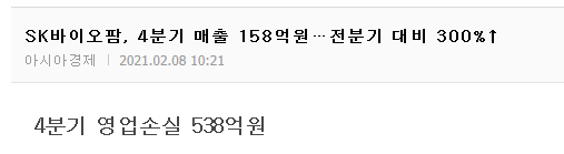2020년 4분기 매출액 158억원, 영업 손실 538억원을 기록했습니다. 바이오팜의 매출액은 지난 분기 대비 약 300%증가했는데요.