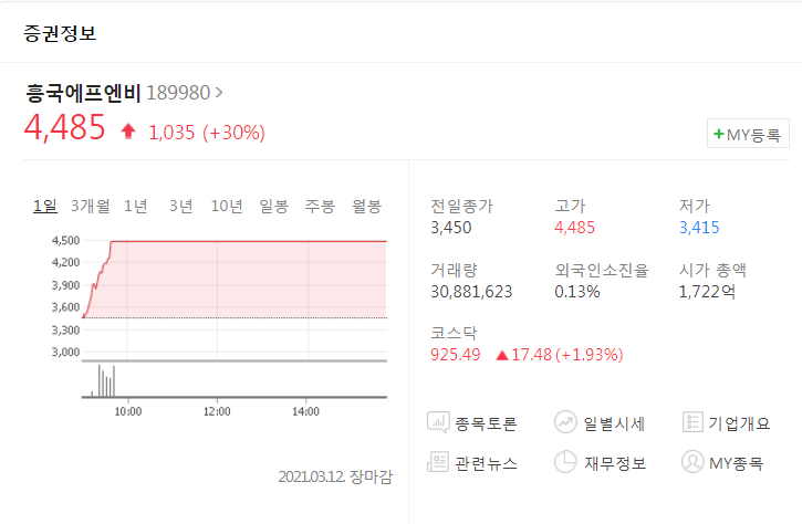 흥국에프엔비는 상한가를 기록했네요. 쿠팡관련주 였기도 했는데요. 쿠팡이 상장하면서 쿠팡 관련주도 많은 상승을 했죠. 물론, 또 정말 좋은 기업이 아니라면 다시 내려왔지만요. 저는 이런 관련주들을 아직은 한번도 투자해본적이 없습니다. 흥국에프엔비는 청량음료, 영양식품, 과즙음료 등의 제조 및 판매를 주요 사업으로 하고 쿠팡이나 마켓컬리등에 납품을 하는 것 같습니다.