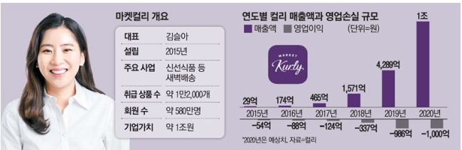 마켓 컬리는 아직 쿠팡과 비슷하게 적자이지만, 적자 폭이 감소하고 있고 2020년에는 매출 1조원을 달성 했는데요.