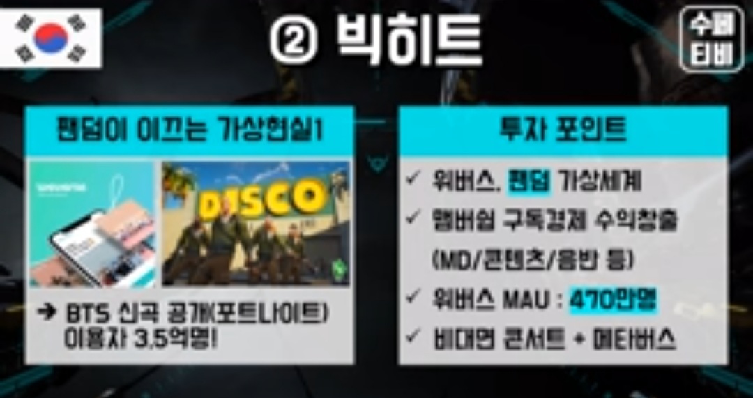 빅히트는 위버스라는 플랫폼을 통해서 팬덤을 구상하고 스타들의 굿즈등을 판매하는 식의 기존에 없던 새로운 방식을 추구하고 있습니다. 그리고 현재까지 대성공을 거두고 있죠.