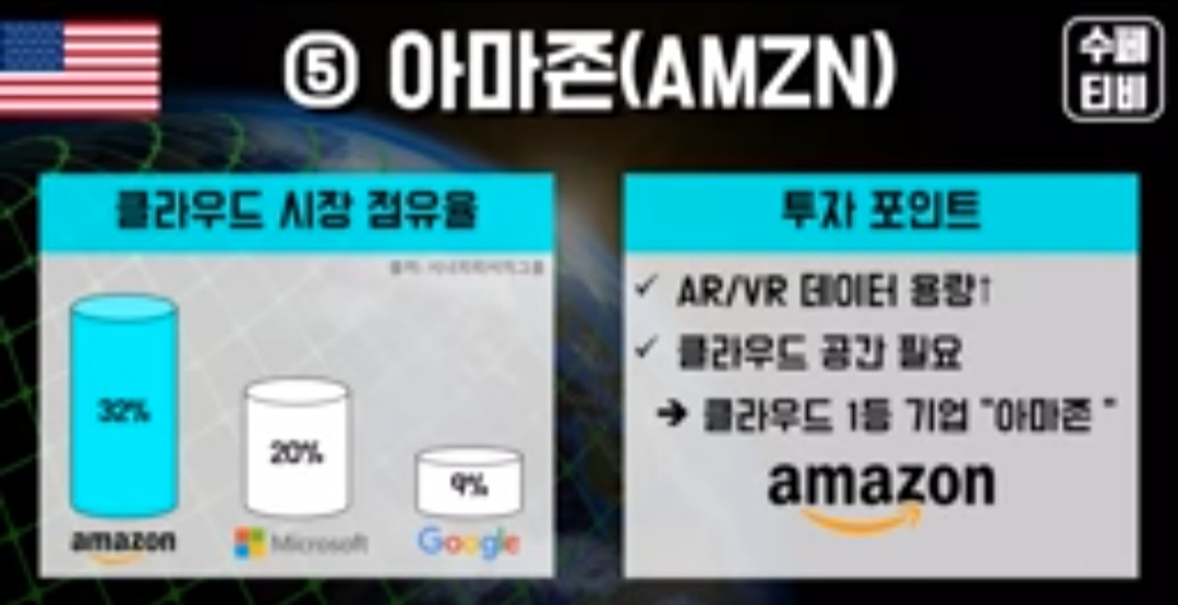 아마존은 메타버스 세상의 발현으로 수혜가 기대되는 기업입니다. 바로 미국 클라우드 시장 점유율이 가장 큰 기업이기 때문이죠. 아무래도 메타버스 세상이 제대로 구현되고 많은 사람들이 이용하게 되려면, 큰 데이터를 축적하고 유지할 수 있는 곳이 많이 필요할 것입니다.