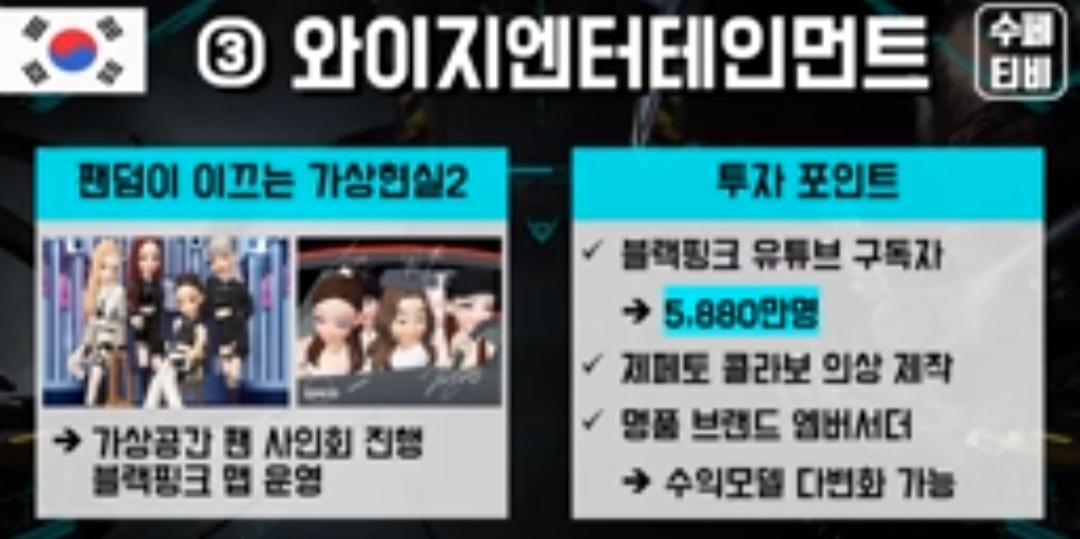 영상을 보면서 어라? YG가 왜 들어가지? 라는 생각도 했었는데요. YG도 이러한 메타버스 변화의 흐름에 맞추어 블랙핑크등이 활발히 활동하고 있습니다. JYP나 SM은 따로 언급되지 않는것으로 보아 이들보다 YG가 메타버스 세계에는 좀 더 열심히 발을 뻗고 있는 것으로 보이네요.