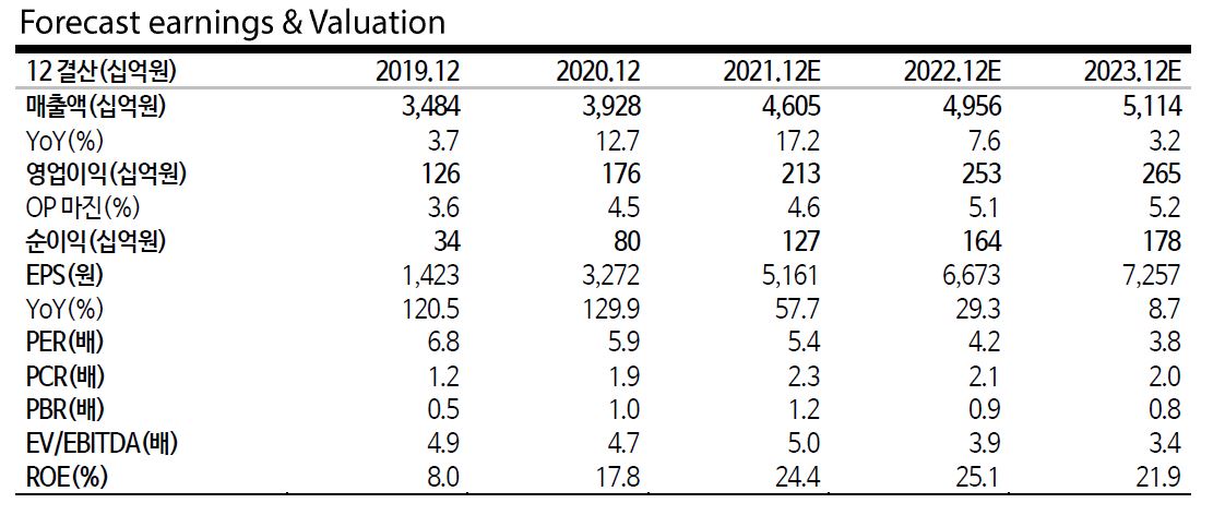 코오롱 글로벌의 5년 평균 Per는 약 11배 정도이며, 현재 2021년 예상 실적 기준으로는 5.4배 수준입니다. 건설업이 전체적으로 저평가되어 Per가 평균 Per가 6.6배 수준인데요. 그 중에서도 코오롱 글로벌은 현재 저평가 되어 있습니다. 따라서 2021년 영업이익은 약 2,128억원으로 기대되고 있는데요. (약 연간 20.6% 성장한 수치)