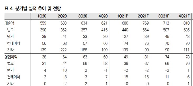 팬오션은 1분기 영업이익 489억원을 달성했는데요. 매출액은 전년대비 21.6% 상승한 6,799억원 입니다. 벌크선 운임이 상승했고, 팬오션은 계속해서 선대 확장을 추진했습니다. 다만, 탱커 시장은 운임이 하락해서 실적이 별로 좋지 않았구요. 컨테이너선은 비중이 적지만 운임이 좋았기 때문에, 32.6% 전년 대비 상승했다고 합니다. 시장은 약 594억원의 이익이 발생할 것이라 예상햇었는데요.