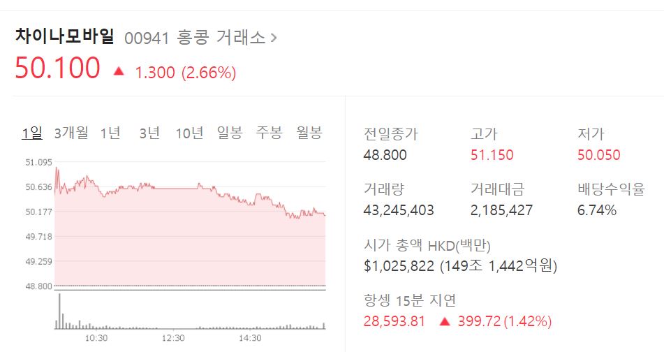 차이나모바일은 “본토 증시 상장을 통해 모금된 자금은 5G망 건설 프로젝트, 스마트 홈 건설 프로젝트, 차세대 정보 기술 연구개발(R&D), 신규 인프라 건설 등에 사용할 것”이라며 “본토 증시 복귀는 회사의 발전을 효과적으로 끌어올릴 것으로 기대한다”고 밝혔다고 합니다. 이 소식은 차이나 모바일 주주분들에게 정말 좋은 소식이라고 생각되네요. 아무래도, 중국 본토 자금이 더욱 유입될 수 있을 테니까요.