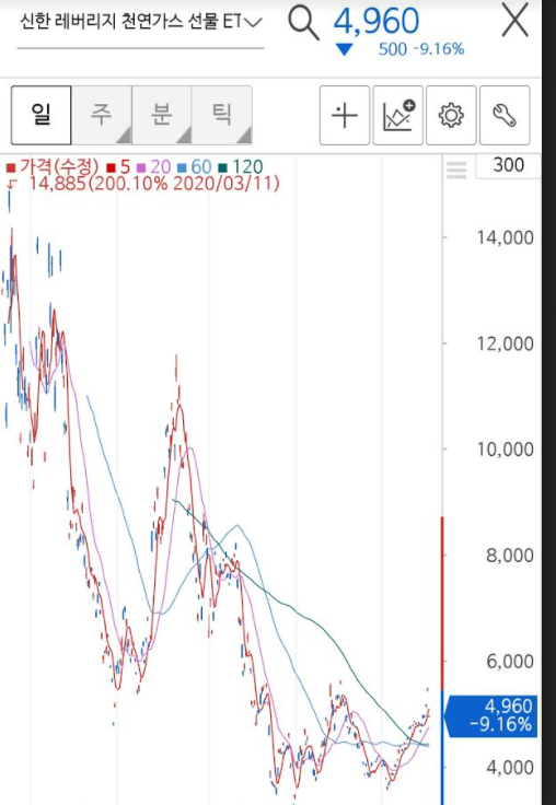 신한 레버리지 천연가스 ETN은 더 많이 떨어져서 -9% 하락했네요.
