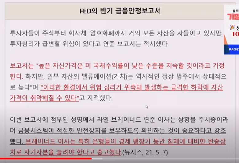 연준에서 최근 발표한 반기 금융 안전 보고서에서는 너무 자산가격이 많이 오른 것에 대한 걱정을 해야 한다는 의견이 나와있다. 즉, 이러한 상황에서 자산 가격이 큰 폭의 하락이 있을 경우 또는 부양책이 사라질 경우 이는 경제에 큰 충격을 줄 수 있다는 것이다. 연준은 이에 대한 대비책으로 현재 은행들이 과거 대규모 경제 위기에 비해 엄청나게 건전한 상황이지만, 은행들이 추가적으로 자본을 쌓을 수 있는 정책에 대한 고민을 하고 있다.