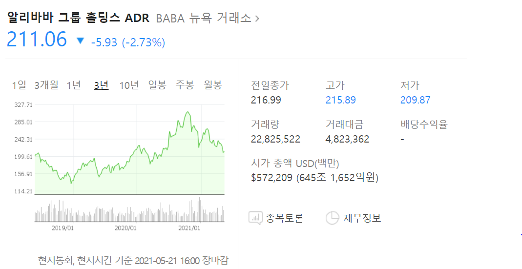 코로나 폭락장 때의 가격이 약 200$ 아래 선 이었는데요. 최근 중국 당국의 엄청난 규제, 앤트 그룹의 상장 실패등으로 급격하게 하락해서 반등을 못하고 있죠.