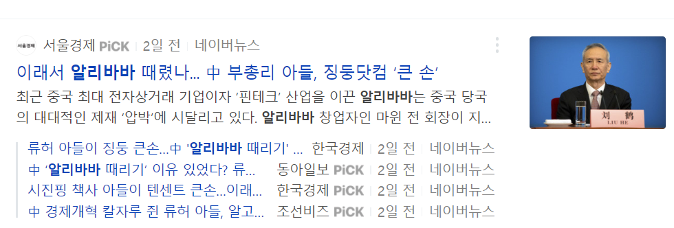 알리바바는 최근 정부에게 1조원 상당의 벌금을 맞기도 했고, 위의 기사처럼 류허 부총리의 아들이 알리바바를 위협하는 제2기업인 징동닷컴에 거액을 투자한 사실이 밝혀지며 언론의 공격을 받고 있습니다.