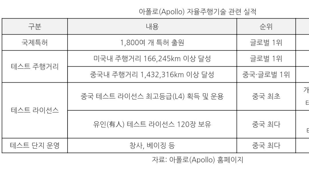 바이두가 자체 개발한 자율주행 소프트웨어 아폴로는 이미 그 기술력이 입증. 택시는 이미 상용화를 시작했죠.