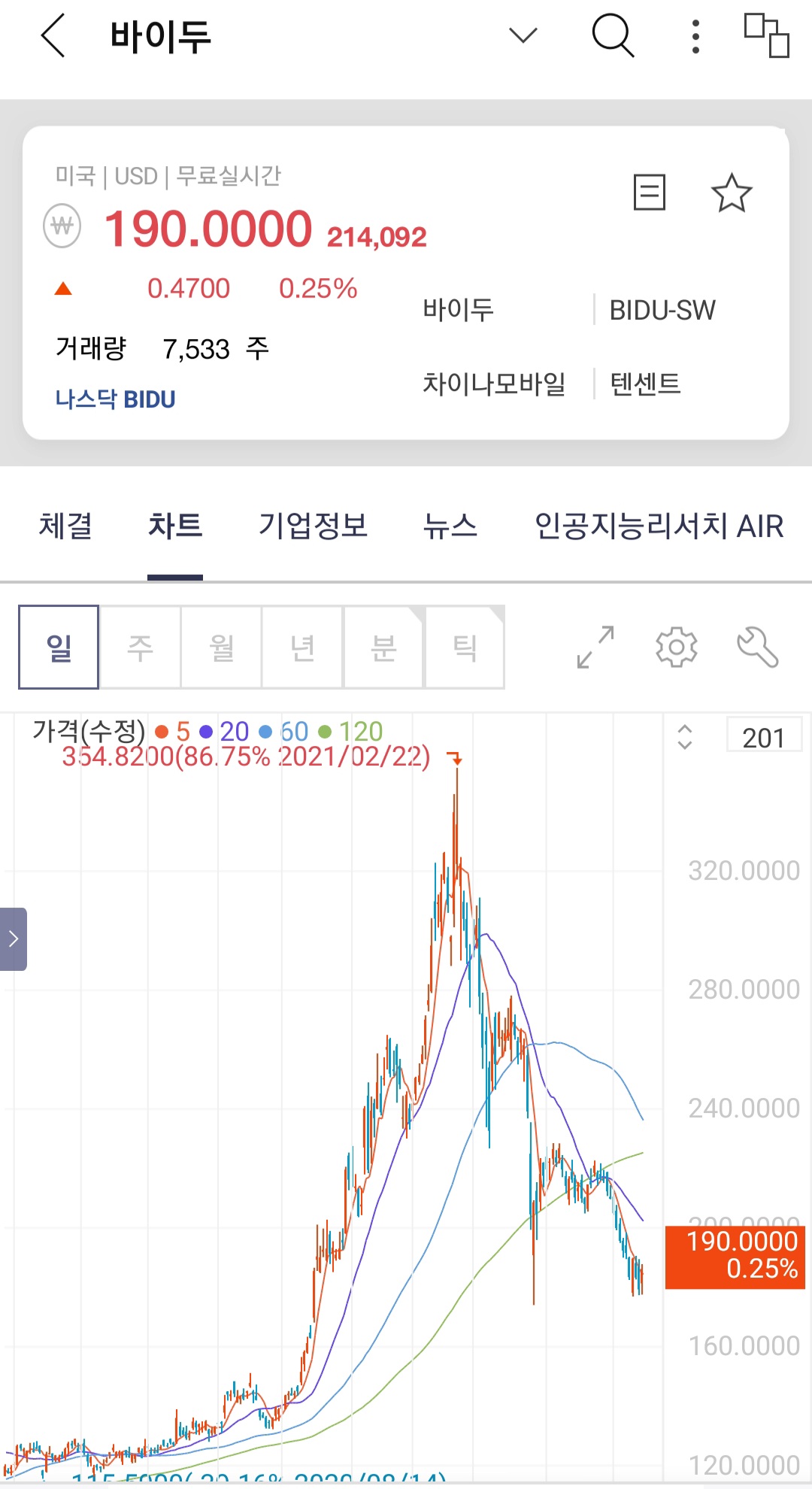 최근 들어 바이두는 아케고스 빌 황의 파산 등으로 인해 주가가 최고점 대비 반토막이 나면서 계속해서 하락하는 모습을 보여주고 있네요.