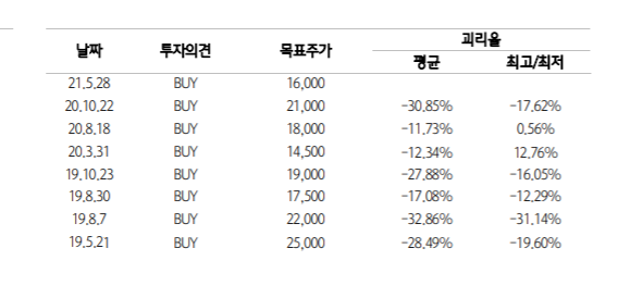 그래서 원래 하나금융투자 증권의 목표주가는 21,000원이었지만 16,000원으로 주가를 하향 조정 했습니다.