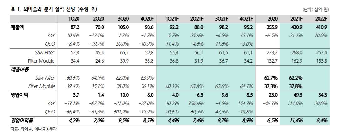 박강호 대신증권 연구원은 이날 보고서에서 “삼성전자의 프리미엄 스마트폰 생산 차질, 갤럭시S21 판매 둔화로 와이솔의 2021년 주당 순이익(EPS)을 하향, 목표주가도 1만9000원으로 하향한다”고 말했다.