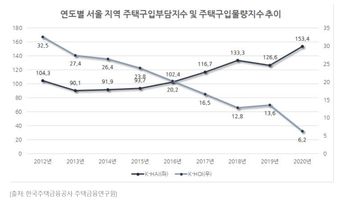 전국 평균 주택구입부담지수는 전분기(52.3) 대비 5.1포인트 오른 57.4를 기록했다. 서울은 2020년 4분기 153.4로, 2008년 4분기(157.8) 이후 12년 만에 최고치다. 2008년 4분기 쯤이면 슬슬 리먼이 터지고 경제 거품이 무너질 끝물인 시점이다.