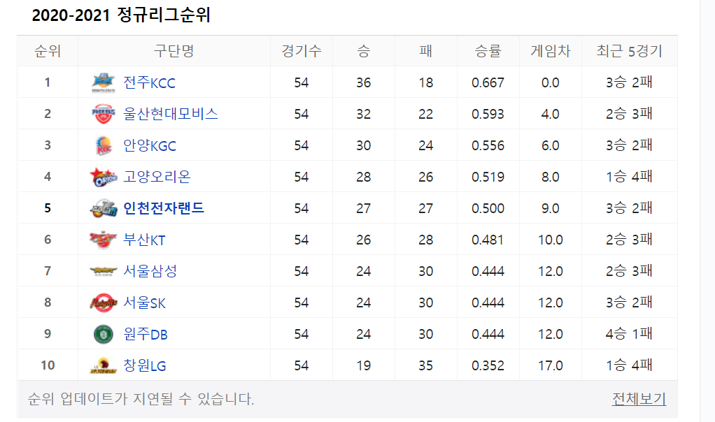 지난 시즌을 보니 10개 팀 중 5위로 중위권에 있는 농구단이네요.