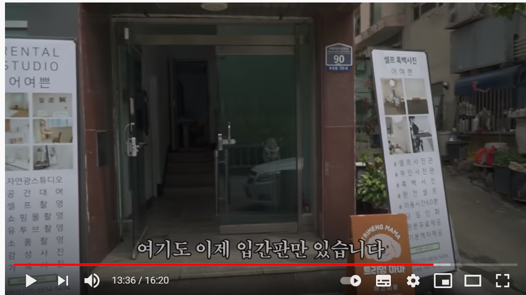 간판을 하게 되면 추가적으로 약 200만원의 비용이 소요된다. 렌탈 스튜디오의 유입은 대부분 온라인으로 일어나기 때문에 비용을 줄이기 위해 간판을 없애는 전략을 했다. 현재 운영되는 렌탈 스튜디오에는 입간판만 있음.