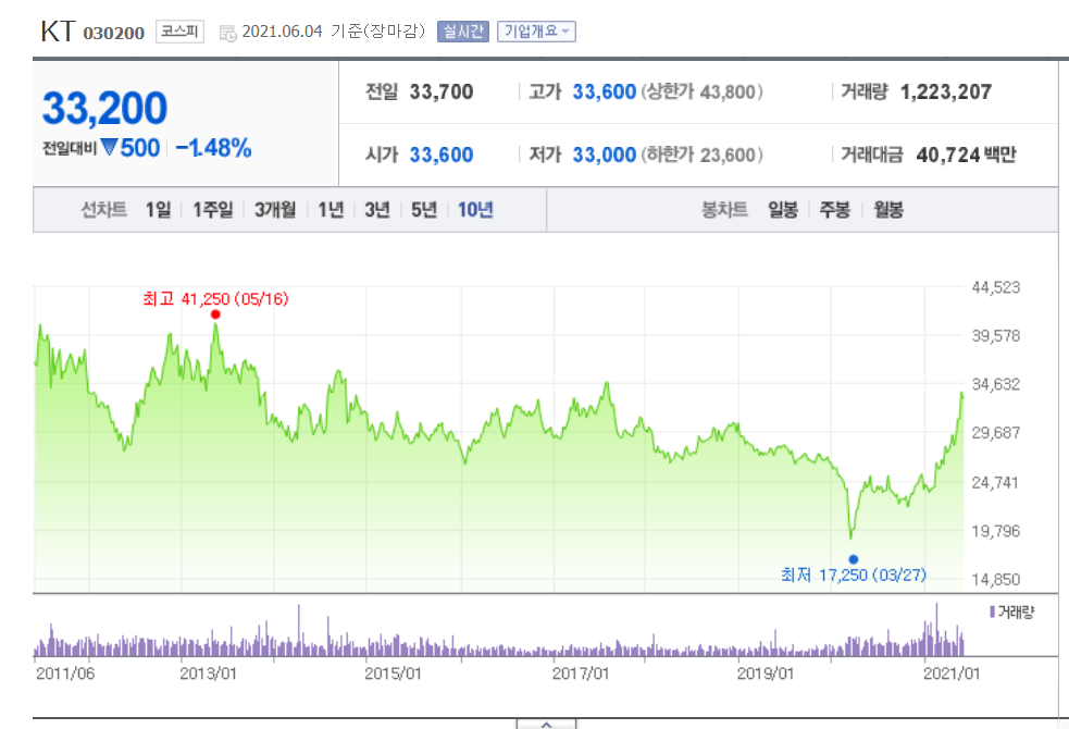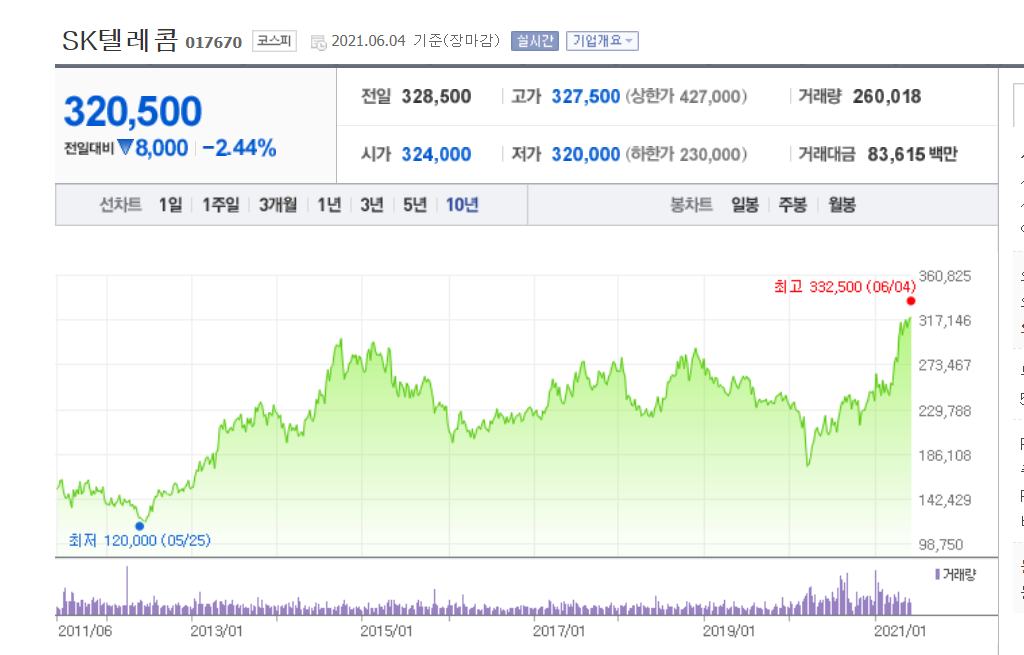 skt의 경우에는 최근 자사주 소각 및 지배구조 관련 이슈들이 있어서 최고점을 뚫긴 했지만, kt나 lg유플러스도 장기간의 하락구간을 지나고 코로나이후 꾸준히 상승한 것을 볼 수 있습니다. 10년 차트를 보면 전고점에 다다르고 있는데요.