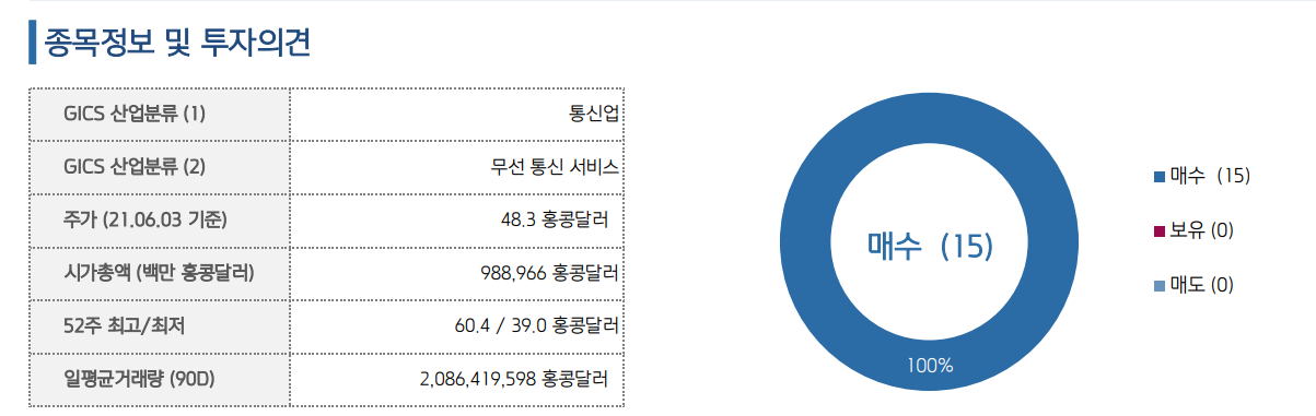 주가는 현재 48HKD 수준으로, 시가총액은 한화 140조원 정도 됩니다. 한창 금리 상승기에 반짝 올랐다가 다시 하락하는 모습을 보여주고 있습니다. 무슨 리포트들인지는 나오지 않아서 잘 모르겠지만 전부 매수의견으로 매수 의견 15개가 표시되네요.