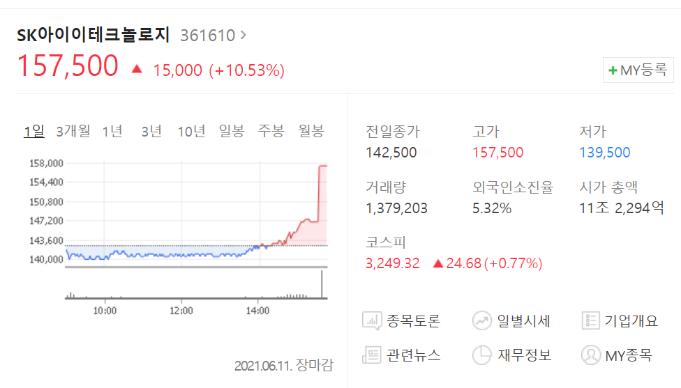 오늘 장 내내 조용하던 SKIET SK아이이테크놀로지의 주가는 장 막판 10% 급등을 하면서 장 마감했는데요.