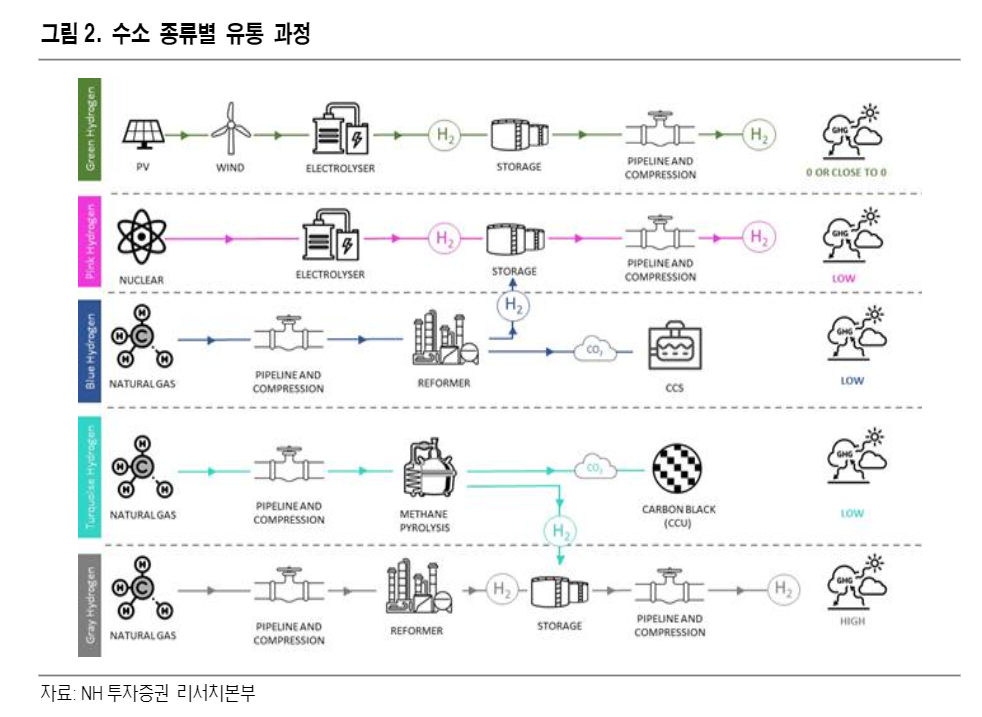 그럼에도 불구하고 기존 회색 수소와 탄소 저장 장치를 결합한 블루수소 대비 강점을 가지고 있음. 탄소 활용 용이, 기존 천연가스 인프라망을 활용할 수 있다는 측면에서 청록 수소의 역할 확대 가능할 전망.