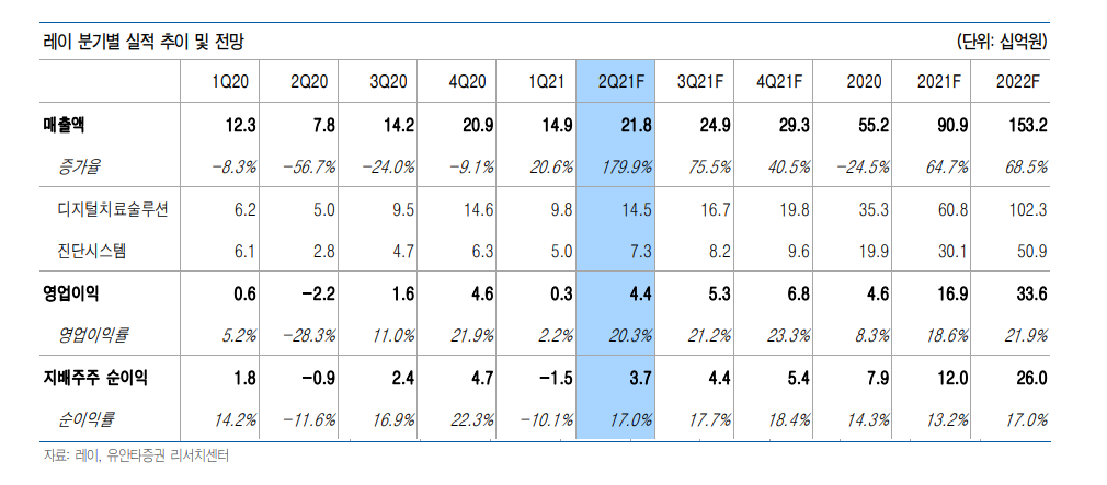 2021년 레이 실적은 매출액 909억원(+64.7%, YoY)과 영업이익 169 억원(+269.2%, YoY)으로 예상한다.