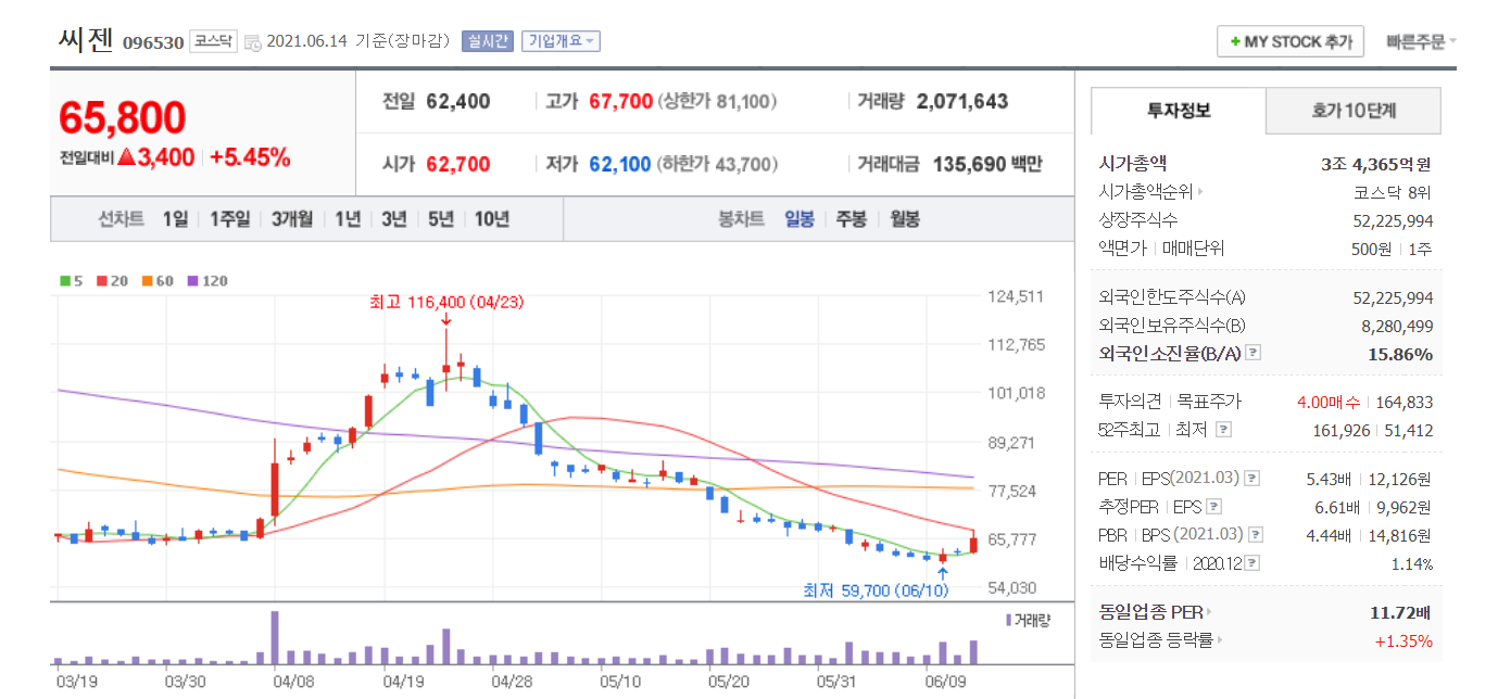 신규로 씨젠을 매수하신 분들은 좋으시곘지만, 그 전 주주분들은 아직 간의 기별도 안가실 것 같습니다. 고점 대비 거의 50%로 연일 하락만 했었죠. 10% 올랐다지만 겨우 65,000원 대. 저는 하반기에 M&A 소식이 발표되면 훨씬 더 상승할 것이라 생각하고 있습니다. 목표수익률은 50%입니다.