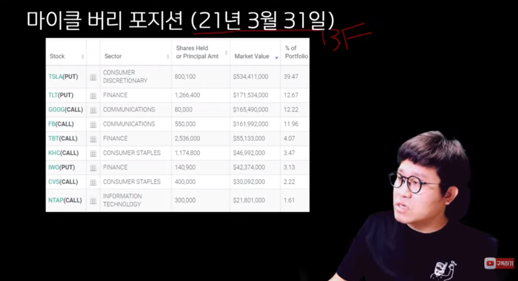 다음으로 김단테님께서는 2021년 3월 31일의 마이클 버리의 포트폴리오를 보여주면서, 현재 마이클버리는 어떤 생각을 가지고 있을까? 에 대해 이야기 해보았습니다.