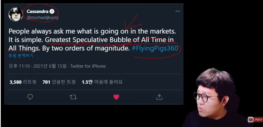 즉, 지금의 시장은 엄청난 버블의 상황이다. 라고 강력하게 메시지를 준 것입니다. 특히 김단테TV 영상 내용에 따르면, #태그에 달려있는 Flying pigs 360의 의미가 무엇일까? 에 대해서 또 화제거리가 되었다고 하는데요.