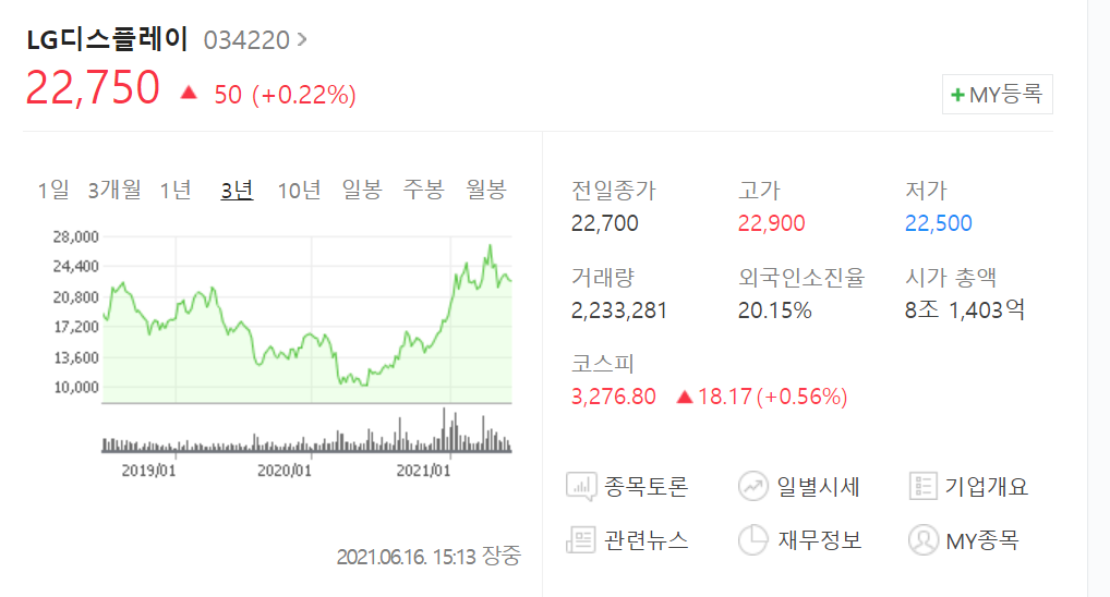 현재 LG디스플레이의 시가총액은 약 8조원대로, 3년 차트를 보면 많이 상승하긴 했네요. 최근에는 더 반등했었다가