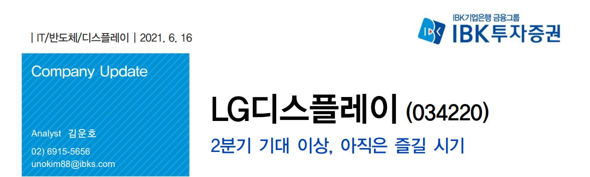 하반기에 좋은 유망 섹터로 OLED가 꼽히곤 하는데, 대장주인 LG디스플레이가 움직이지 않고 궁금해서 리포트를 읽어보려고 합니다. 이번 리포트는 IBK투자증권에서 발간했으며, 오늘자 따근따끈한 리포트 입니다.