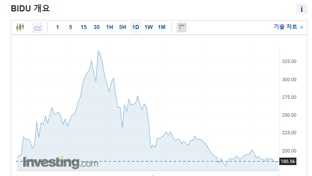 저는 바이두를 향후 5년내에 5배 성장할 수 있는 기업으로 보고 꾸준히 매월 매집을 하고 있는데요. 아마 바이두 주주분들이시라면 현재 매우 힘든 구간을 지나고 계실 것 같아요. 몇개월간 주가가 지지부진하고 움직임이 없는데다가 계속해서 하락하는 모습만 보이고 있기 때문인데요.