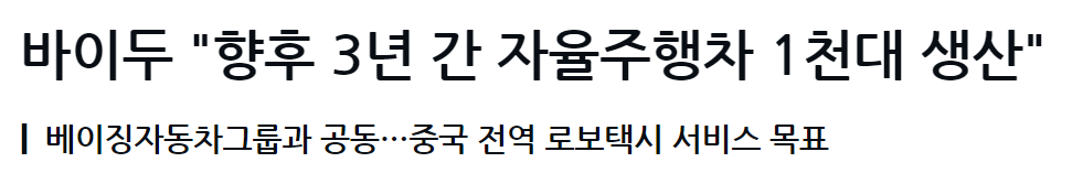 바이두가 앞으로 3년 동안 자율주행차 1천대 가량을 생산한다. 이를 위해 바이두는 중국 국영 베이징자동차그룹과 손을 잡았다. 바이두는 무인자율주행차를 활용해 중국 전역에서 로보택시 서비스를 실시할 계획이다.