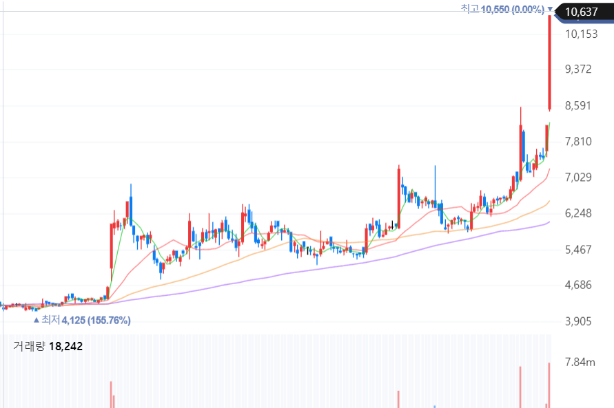 작년 12월 부터 꾸준히 상승하여 결국엔 상한가! 주가는 이미 2배 이상 상승했습니다.
