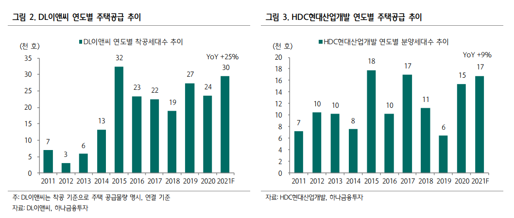 ① DL이앤씨 올해 착공 및 착공예정세대수는 연결 기준 YoY 25% 증가하는 2.9만세대로 추정하며, 주택공급지표 개선
