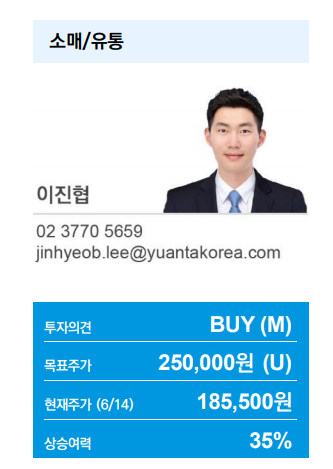 목표주가는 25만원. 상승여력은 최고점인데 불구하고 35%. BGF리테일을 아주 긍정적으로 평가하고 있었다. 6/15자 리포트.