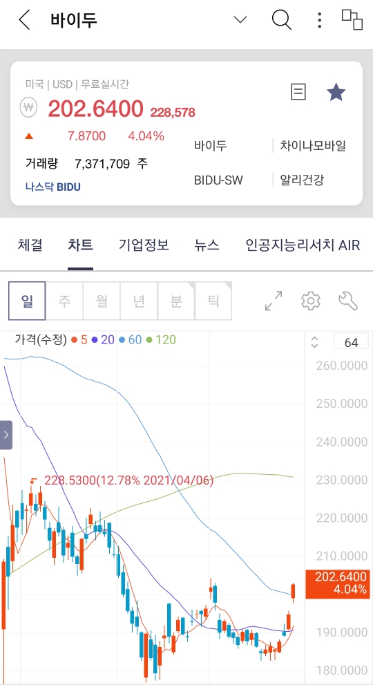 바이두 주가는 최근 바닥을 찍고 190$밑으로 내려갔다가 다시금 반등해주는 모습을 보여주고있는데요. 그 상승세가 조금 빠른것같네요. 바이두관련 좋은호재가 나왔던것 같습니다.