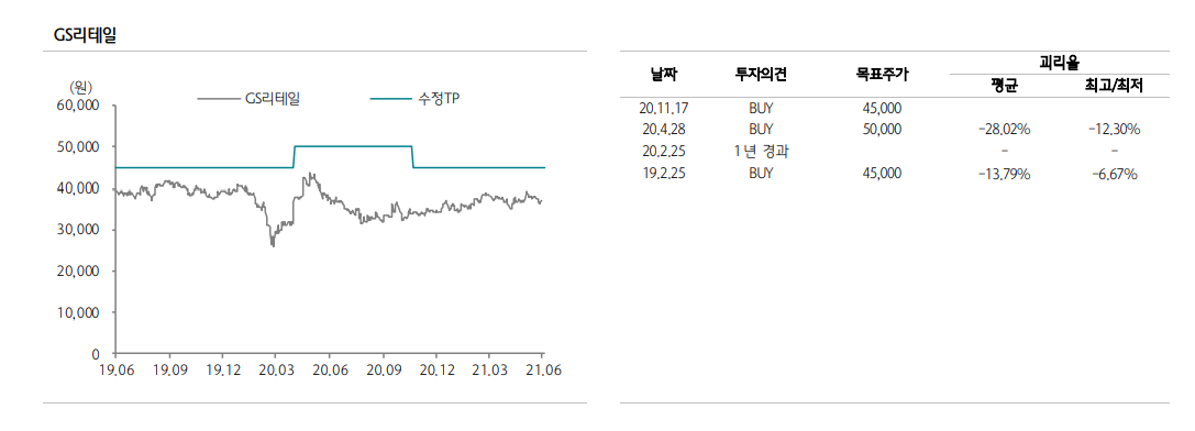 GS리테일의 목표 주가는 45,000원 변동이 없고. 현재는 37,000원으로 20%상승여력이 있는 것으로 평가하네요.