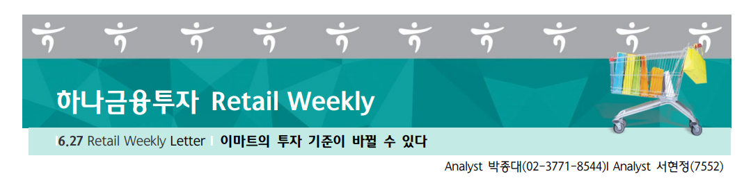 하나금융투자에서 발간한 Retail Weekly 리포트를 살펴보겠습니다. 최근, 리테일 업계의 가장 큰 이슈라고 하면 단연 신세계 정용진 부회장의 이마트가 이베이코리아를 인수한 것이죠.