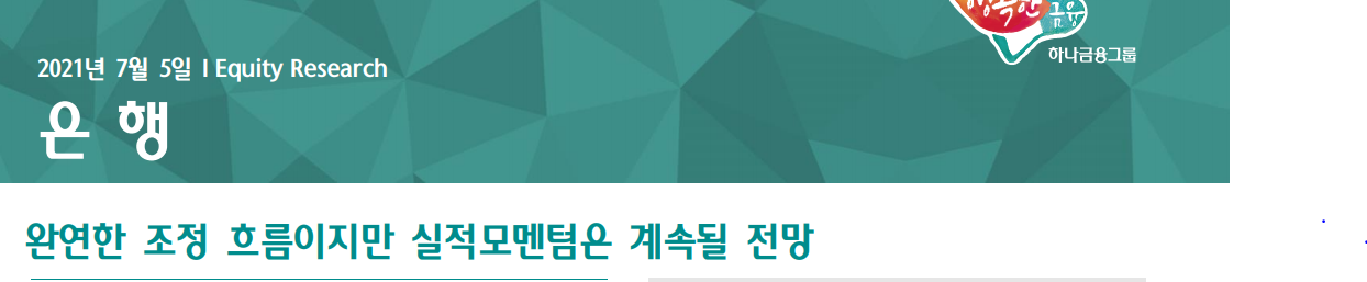 오늘 은행업 관련 하나금융투자 산업 리포트가 나와서 이를 읽어보고 리뷰하려고 한다. 재미있는 것은 가장 선호하는 종목으로 하나금융투자계열의 하나금융지주를 가장 추천했고 상승여력도 매우 큰 것으로 평하고 있다는 점.