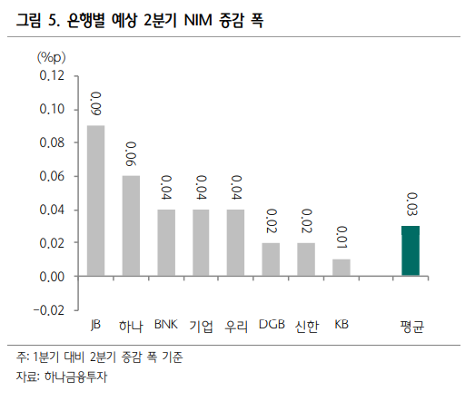 JB금융과 하나금융은 은행 NIM 상승 폭이 9bp와 6bp로 상당히 크게 나타날 전망.