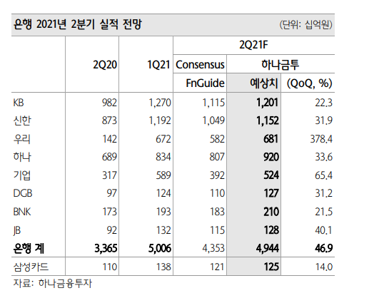 하나금융투자의 가이던스를 보면 거의 모든 은행들이 컨센서스 상회 예상.