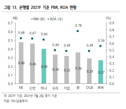 BNK금융지주에서는 지난 리포트에서도 2분기 어닝 서프라이즈를 예고했다. 하나금융지주의 PBR 0.4, BNK금융지주는 0.27 수준.
