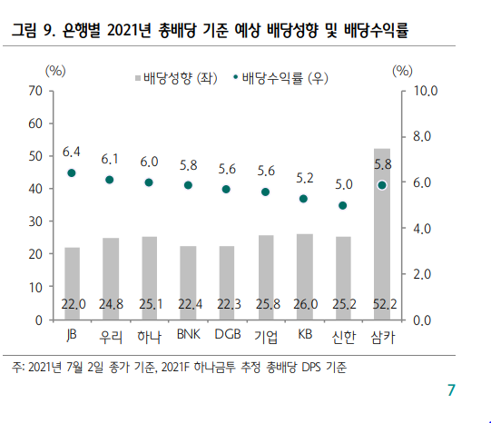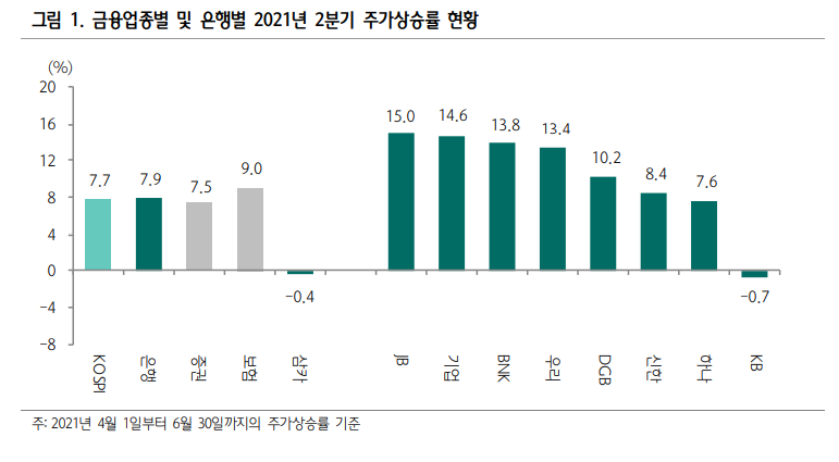 2분기 실적이 서프라이즈를 기록하며 컨센서스를 대폭 상회하는 은행은 하나금융과 BNK금융. 그 외 우리금융과 DGB금융 등도 2분기 순익이 1분기 대비 증익될 가능성이 높다고 판단