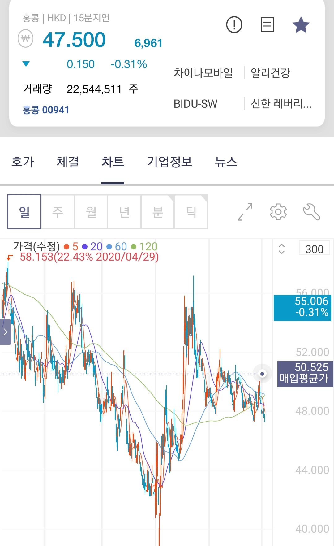 오늘도 바이두와 함께 추가매수완료. 주가가 떯어지면 배당률이 8-9%가 되어버릴테니 매수세가 바로들어옴. 주가의 하방은 지지되고있다. 지지않는투자이기 때문에 충분히 배팅할 수 있다. 2년 뒤에는 어떻게 되어 있을지?