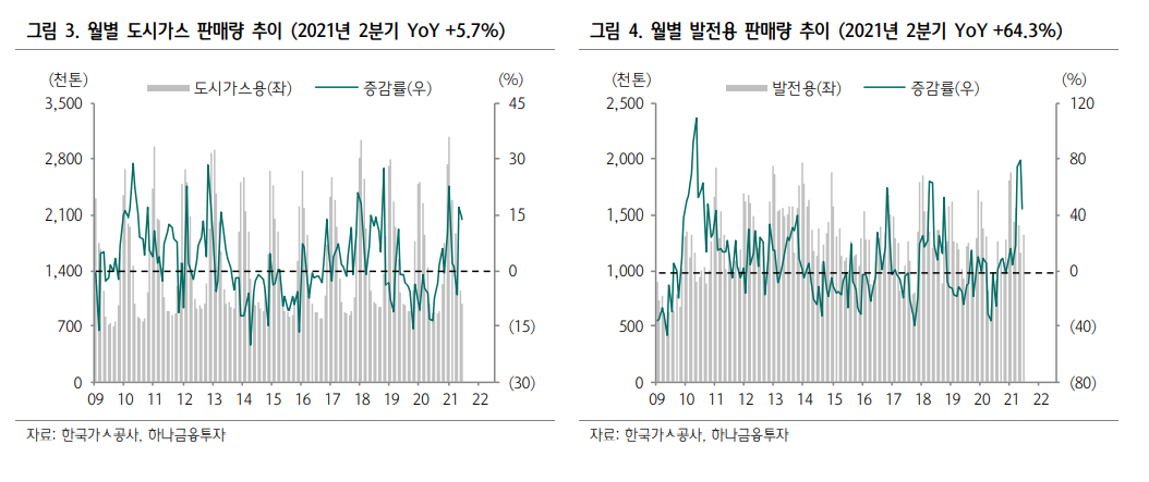 별도 이익은 발전용 공급비 규제 변화로 비수기임에도 흑자 달성이 가능하며 3분기는 적자가 불가피 하지만 적자폭은 크게 줄어들 전망이다. 해외사업은 아시아 LNG Spot 가격이 강세가 유지되면서 Prelude 흑자 기조가 유지될 전망이며 GLNG도 점진적으로 상승한 유가가 반영 되어 이익이 정상화될 것으로 기대된다. 2021년 요금기저에 적용된 유가보다 현재 유가 수준이 높고 판매량도 유의미한 증가를 보이고 있어 4분기 별도 이익 추가 개선이 가능하다.