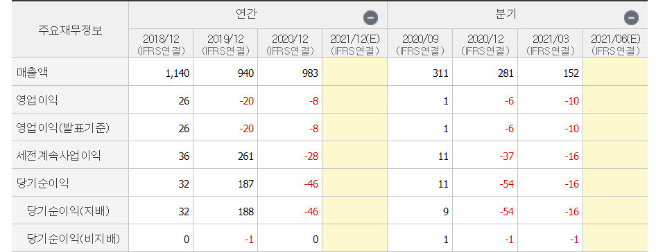 그렇지만, 적자의 폭은 많이 줄었고, 부채 비율은 높지 않다. 1분기는 -10억의 영업이익 적자 기록.