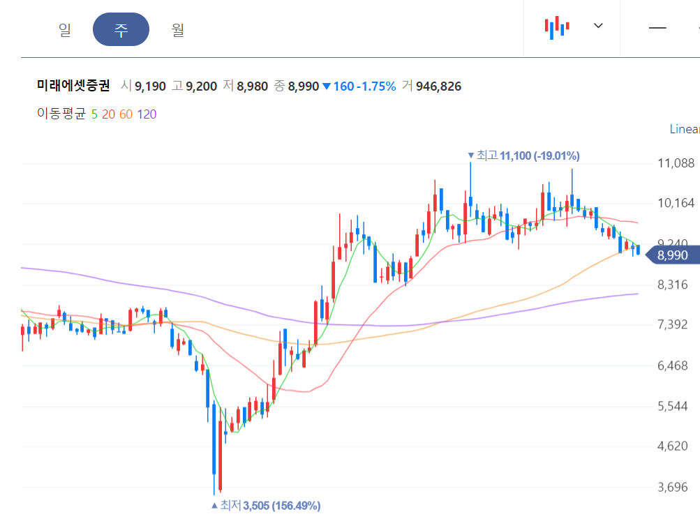 과거 증권업과는 미래에셋대우(현 미래에셋증권)과 인연이 있다. 나에게 소소한 수익을 안겨주었었다. 물론, 그 이후에 더 엄청난 상승을 했다. 나는 코로나 이전에 투자했었기 떄문에 -50%까지 하락했던 것을 약간의 수익을 주고 팔았지만 그 이후에 미래에셋대우 주가는 2배가 된다.