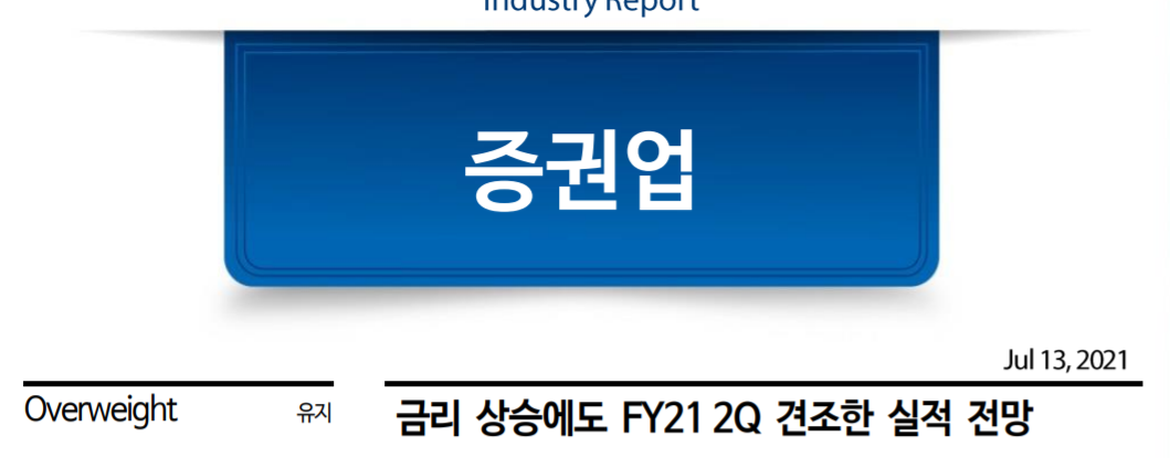 1) 고객예탁금이 60조원대 (2021년 6월말 기준 66.6조원)를 역사적 고점을 유지하면서 일평균거래대금이 20조원 이상 유지 가능할 것. 이에 증권사 위탁매매 및 이자수익의 견조한 이익 시현 예상
