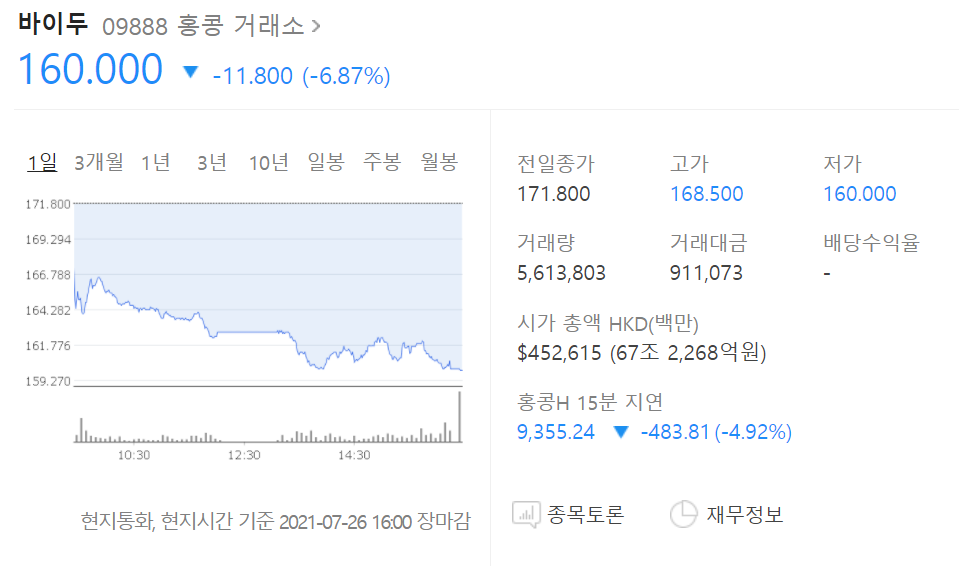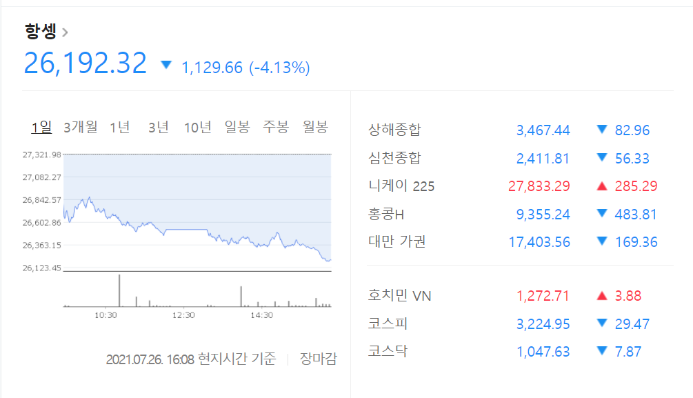 | 홍콩항셍지수 이틀만에 10% 가까운 폭락 중 (바이두 알리바바 텐센트 알리건강 폭락) (0) | 2021.07.27 |